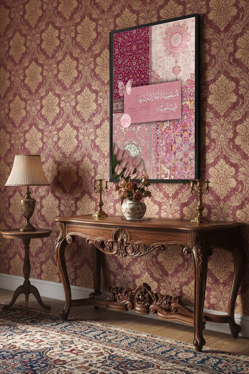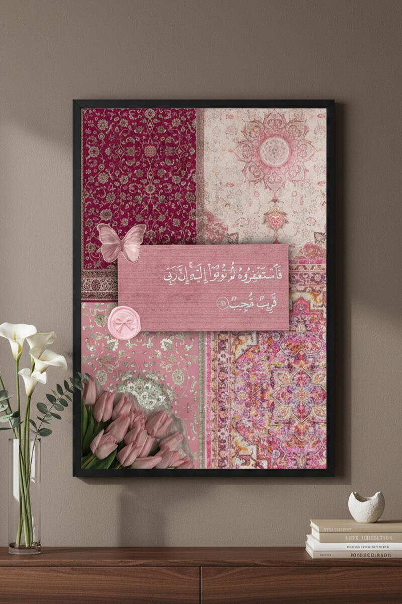 wall frame(فَاسْتَغْفِرُوهُ ثُمَّ تُوبُوا إِلَيْهِ ۚ إِنَّ رَبِّي قَرِيبٌ مُّجِيبٌ) Custom Quranic Wall Art – Pink Tapestry.